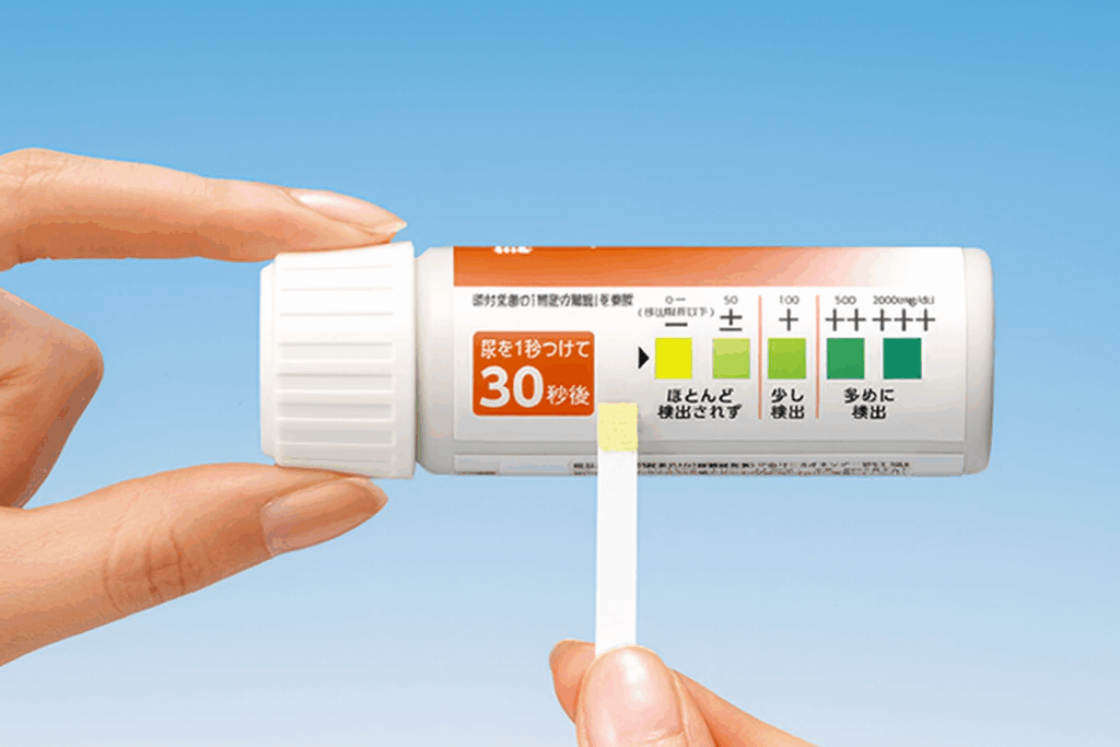 試験紙の判定表またはカラーチャートとの色の比較により、各項目の結果を判定します。結果は通常、陰性(−)、擬陽性(±)、陽性(+、++、+++など)で表され、陽性の程度によって段階的に評価されます。ブドウ糖の判定では陰性が正常な状態です。陽性の場合、糖尿病の可能性がありますが、食後や甘いものを大量に摂取した直後は健康な方でも一時的に陽性になることがあります。また、ストレスや妊娠によっても一時的に尿糖が出ることがあります。繰り返し陽性が出る場合や空腹時でも陽性になる場合は、医療機関での詳しい検査が必要です。ただし、腎性糖尿という血糖値は正常でも尿糖が出やすい体質の方もいるため、尿糖陽性が必ずしも糖尿病を意味するわけではありません。蛋白質の判定でも陰性が正常ですが、健康な方でも激しい運動後、発熱時、起立時などに一時的に陽性になることがあり、これを生理的蛋白尿といいます。特に長時間立っていた後に採尿すると陽性になりやすい傾向があります。持続的に陽性の場合、慢性腎臓病、糸球体腎炎、ネフローゼ症候群などの可能性があるため、医師の診察を受けることが推奨されます。