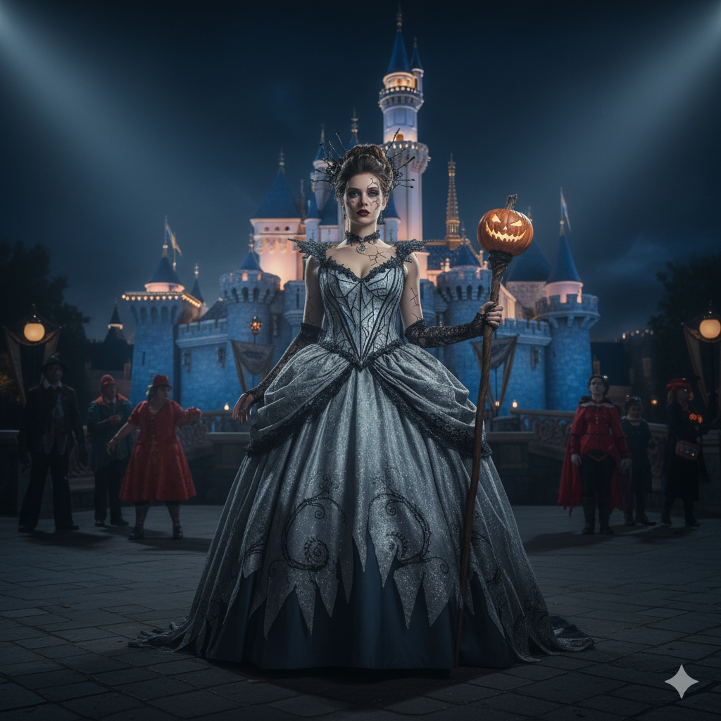 東京ディズニーランドは、「キングダム(王国)」としてのファンタジー性が強く、シンデレラ城を中心とした華やかな世界観が特徴です。パレードも「ザ・ヴィランズ・ハロウィーン」といった、キャラクター中心の分かりやすく祝祭的なテーマが設定されることが多く、明るく楽しい雰囲気の中でのハロウィーンが展開されます。このパークで特に映えるのは、ディズニープリンセスやクラシック作品のキャラクターの仮装です。シンデレラ城前やファンタジーランドは、これらの仮装にとって最高の舞台となり、まるで物語の一部になったかのような写真を撮ることができます。また、パレードに登場するキャラクターの仮装も非常に人気があります。