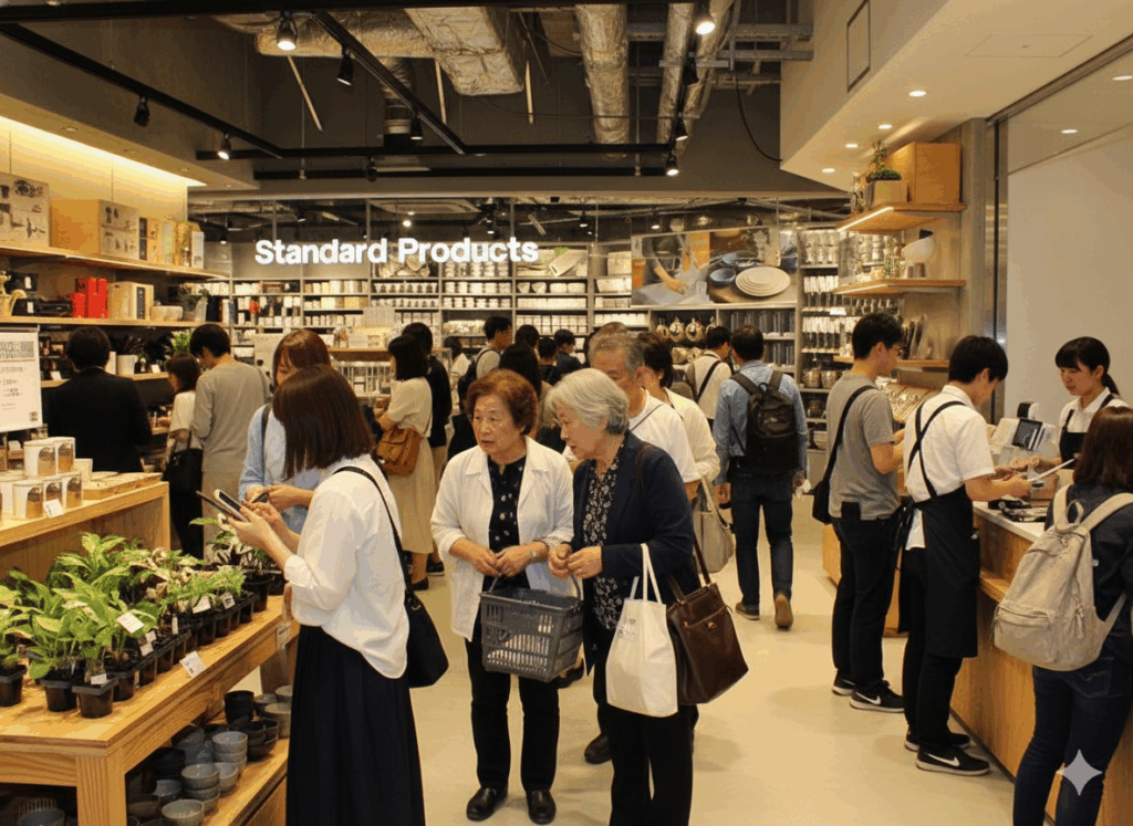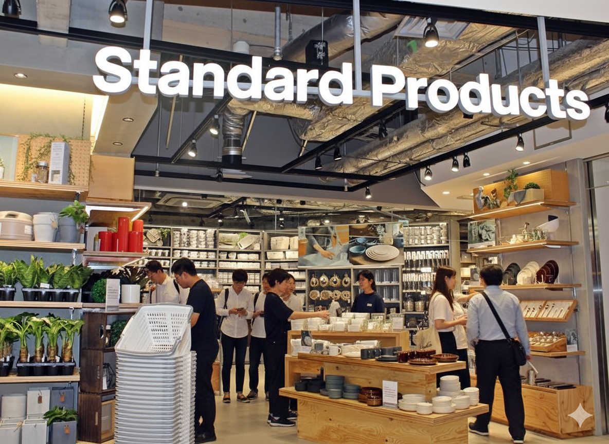 さらに興味深いのは、同じフロアに100円ショップのダイソーも出店しているという点です。一見すると、自社ブランド同士が競合してしまうように思えますが、これは計算され尽くした戦略です。お客様は、まずダイソーで100円の実用品に触れ、その後、すぐ隣のStandard Productsで「ちょっといい」商品を体験することができます。この物理的な比較体験が、Standard Productsの価値を何倍も鮮明に印象付けるのです。ダイソーからStandard Productsへという自然な流れは、顧客のライフスタイルの変化に寄り添う、巧妙なブランド戦略と言えます。