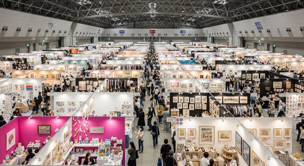 会場では、オリジナルのアート作品、ハンドメイドのアクセサリー、洋服、雑貨、イラスト、写真、立体作品など、多岐にわたる作品が展示・販売されています。プロからアマチュアまで、幅広いクリエイターが参加しており、一点ものの作品も多いため、気に入った作品があれば早めに購入することをおすすめします。「後でもう一度来よう」と思っても、広い東京ビッグサイトの会場で同じブースに戻るのは意外と大変です。
