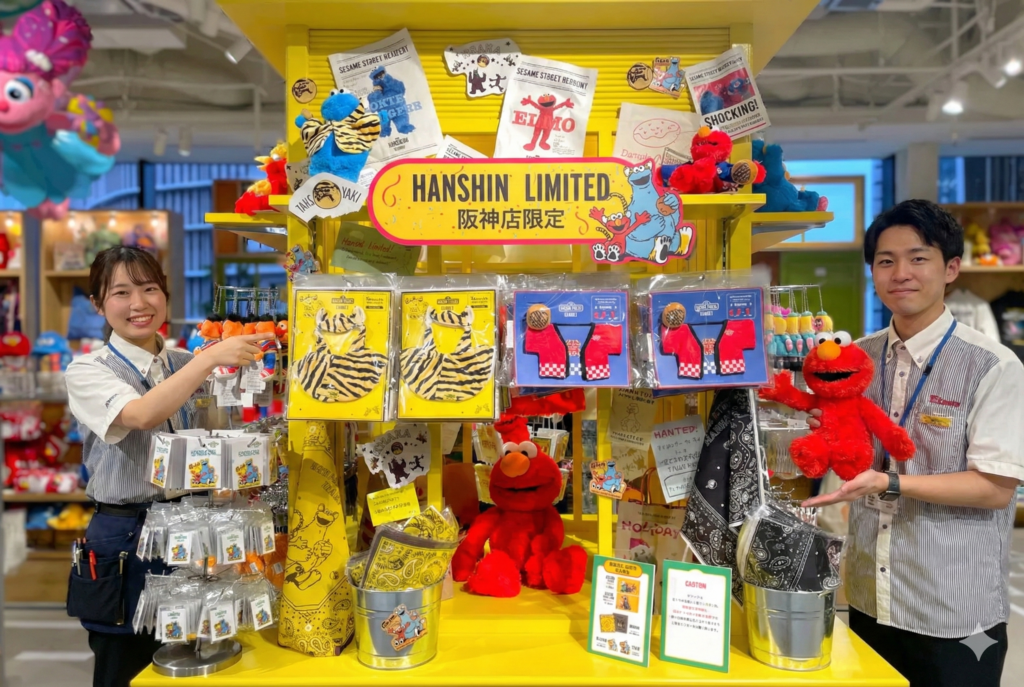 店舗の広さは約100坪(約330平方メートル)という百貨店のインストアショップとしては破格のスケールを誇り、ニューヨークのストリート感をベースに大阪の活気ある雰囲気を融合させたデザインが特徴です。エルモの赤、クッキーモンスターの青、ビッグバードの黄色といったシグネチャーカラーが随所に配され、足を踏み入れた瞬間からセサミストリートの世界に没入できる空間が広がっています。
