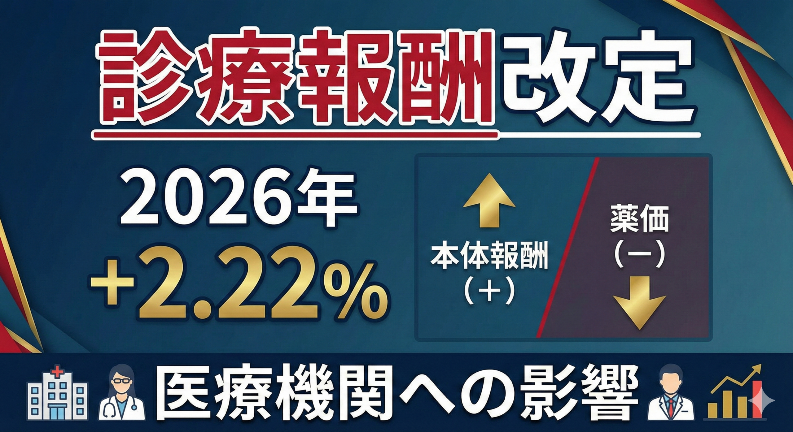 2026年度診療報酬改定の改定率は全体でプラス2.22%となり、その内訳は本体報酬(技術料・人件費)がプラス3.09%、薬価・材料価格がマイナス0.87%という結果となりました。2025年12月23日の閣僚折衝で正式決定されたこの改定率は、本体部分の引き上げ幅が3%を超えるものとしては1996年度以来、実に30年ぶりの大幅なプラス改定です。この歴史的な改定は、インフレ経済への移行に伴う医療機関の経営危機への対応と、医療従事者の賃上げを最優先課題として実現されたものであり、病院経営や患者負担に大きな影響を与えることになります。この記事では、2026年度診療報酬改定の詳細な内訳から、医療機関への具体的な影響、そして患者負担の変化まで、知っておくべき情報を網羅的に解説していきます。