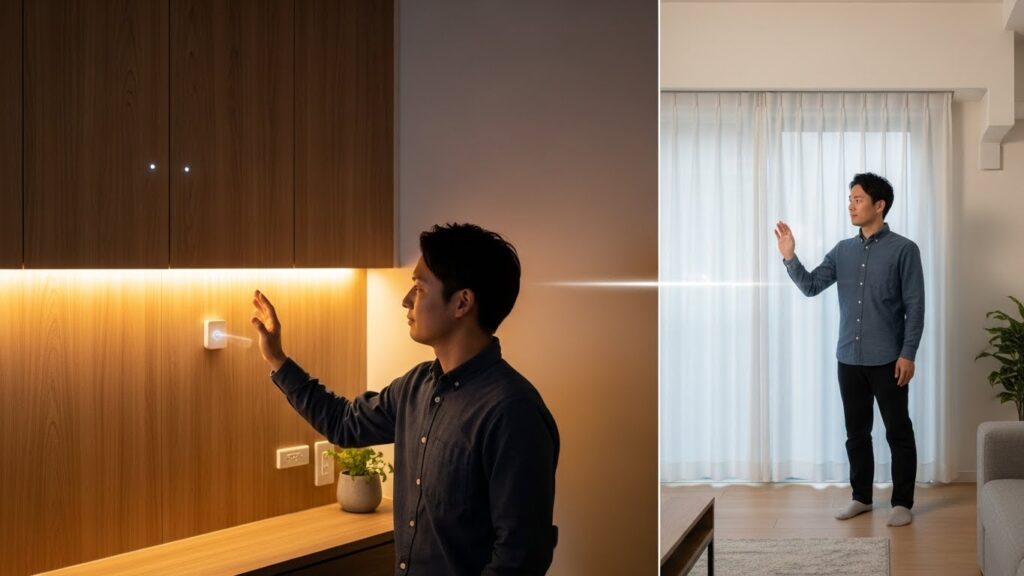 CES 2026の展示のもう一つの核となるのが、「Movement-based Lighting Control(身体動作による照明制御)」です。これは、従来の人感センサー(人がいればON、いなければOFF)を遥かに超えた、文脈理解型の制御システムです。mui LabのSpatial AIは、居住者の自然な身体の動きをインターフェースとして認識します。
