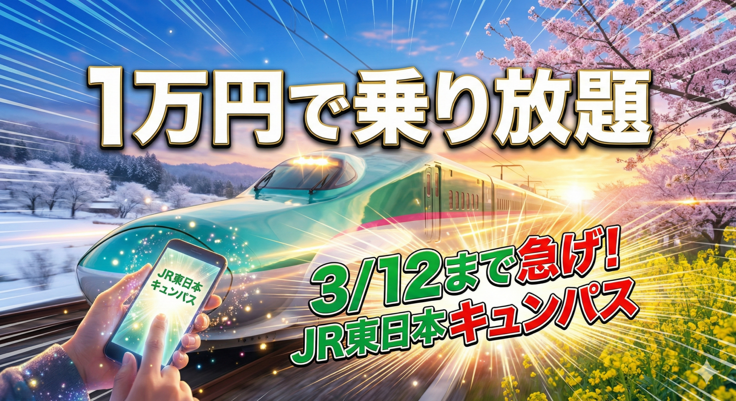 JR東日本の「旅せよ平日!JR東日本たびキュン♥早割パス」(通称キュンパス)は、1万円でJR東日本全線が乗り放題となるお得なきっぷです。2026年版は2月12日から3月12日までの平日に利用でき、新幹線を含む全路線が対象となります。購入は「えきねっと」限定で、利用日の14日前までに予約する必要があります。