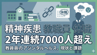公立学校教職員の精神疾患による休職者数が2年連続で7,000人を超え、令和5年度は過去最多の7,119人、令和6年度も7,087人を記録しました。全教育職員の約0.77%、130人に1人が心の病で休職する深刻な状況です。本記事では、若手教員の消耗、定額働かせ放題と呼ばれる給特法の問題、教員不足の負の連鎖など、構造的な要因と対策を詳しく解説します。